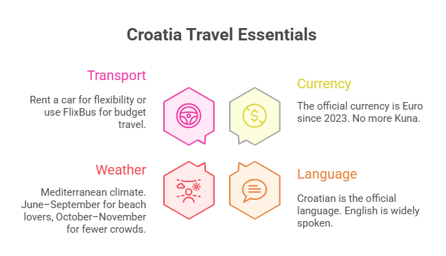 - Must-see: Hvar Island (lavender fields) and Brač Island (Zlatni Rat beach).
